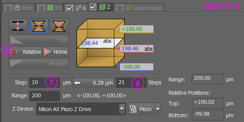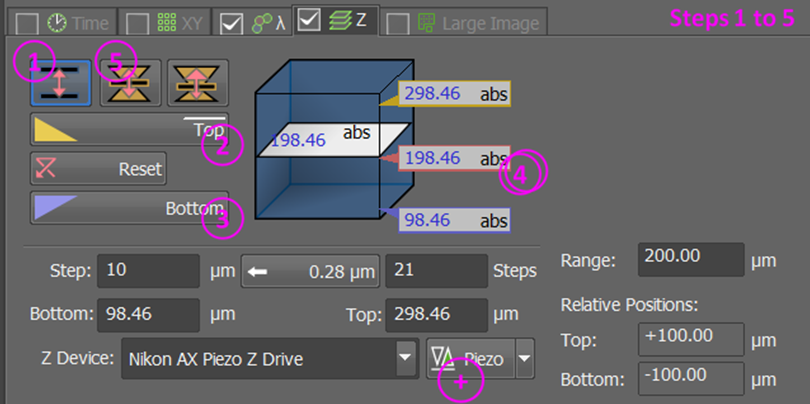 The z-stack must be defined around the center; see buttons marked 5 and 6 in the step-by-step guide below!